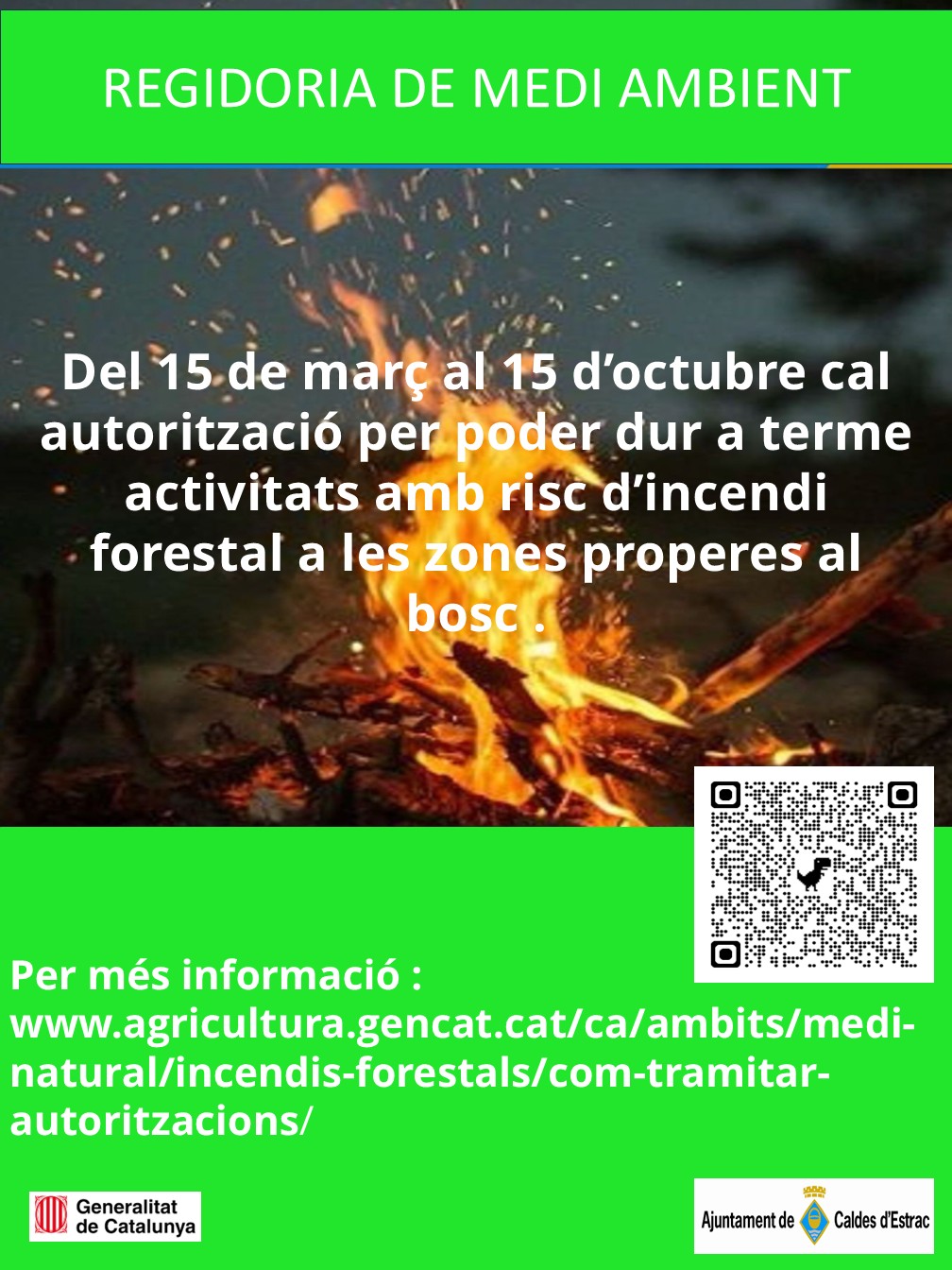 Tant les declaracions responsables com les autoritzacions resten condicionades pel nivell de perill d’incendis forestals que presenti el mapa oficial de perill municipal publicat diàriament per la Generalitat de Catalunya. Cal consultar aquest mapa abans de realitzar l’activitat per si ha quedat suspesa pel nivell de perill d’incendis forestals.